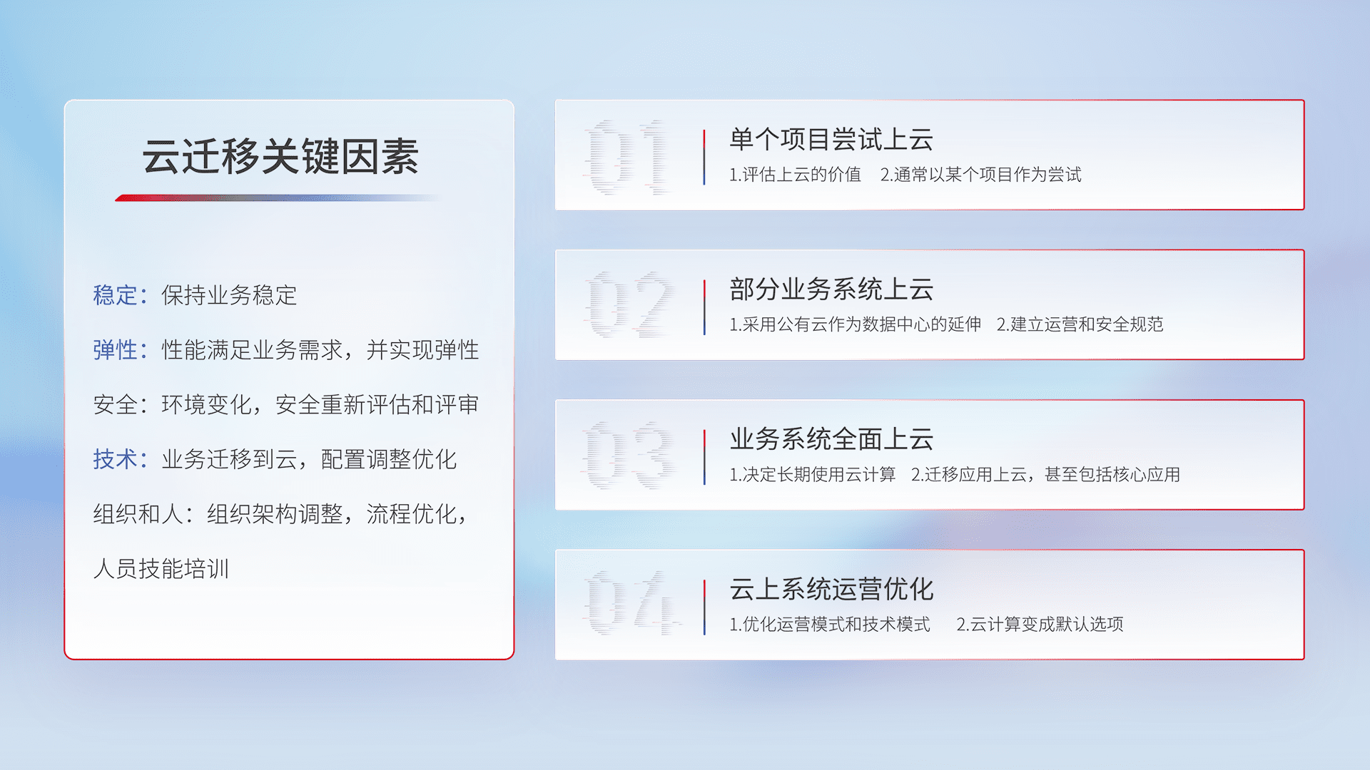 结合实际业务,,,,从规划设计、、、、云平台选型、、云原生改造、、、、数据迁移、、、集成交付,,,迁移全过程为客户识别最佳上云路径,,,做好风险识别管理,,,设计网络架构、、身份权限、、、、安全审计合规、、、、操作审计、、、日志审计、、、监控告警策略、、、、多站点容灾设计等,,,,对云上基础设施进行整体规划,,提升IT治理水平,,,以满足弹性、、、高可用、、高性能的需求。。