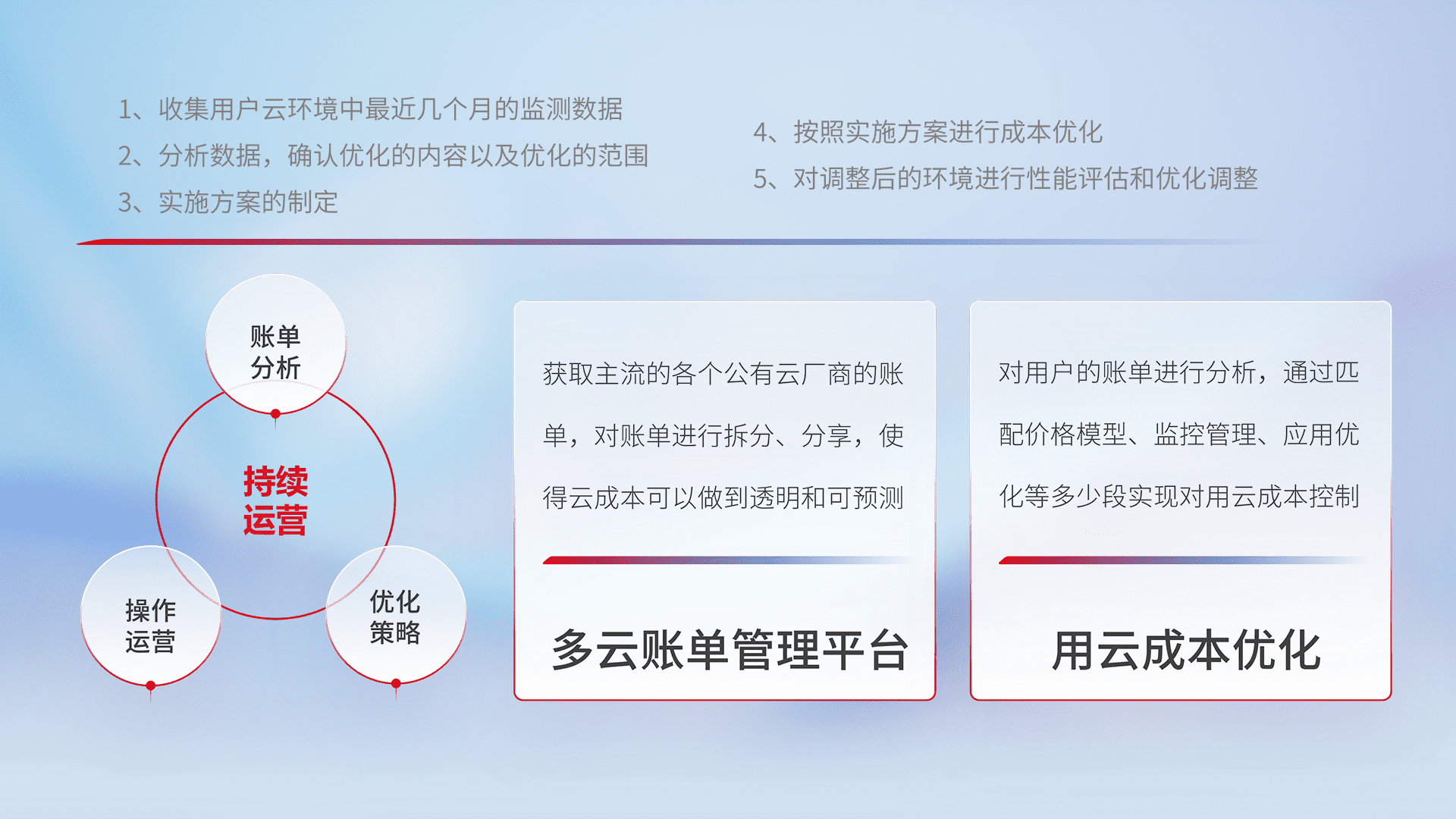 通过多云纳管,,,,以统一的资源数据模型把客户的云资源进行抽象和封装,,,,进而实现对多云资源的统一操作,,保障云资源管理的可靠性、、、稳定性与可用性。。。。量身定制化运维内容,,,,配置、、、开发运维、、、补丁管理、、、备份、、监控、、、、认证和访问管理、、、审计和日常巡检等,,保障在用云过程中的可靠度,,,稳定度以及高可用率。。。